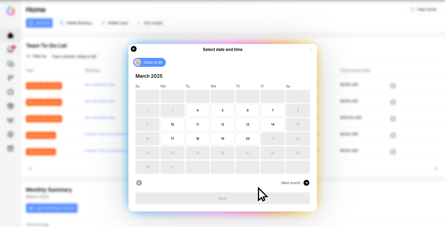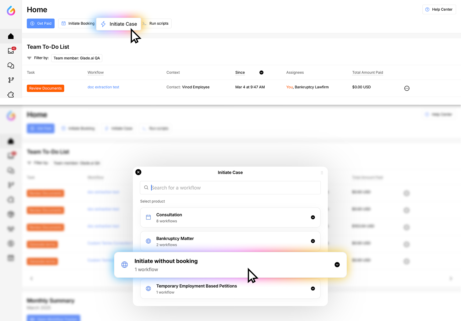 Attorneys can easily kick-start the client intake process from the Glade dashboard. By using the “Initiate Booking” button, you can schedule a consultation and create a new workflow on behalf of a potential client—all without leaving your dashboard.