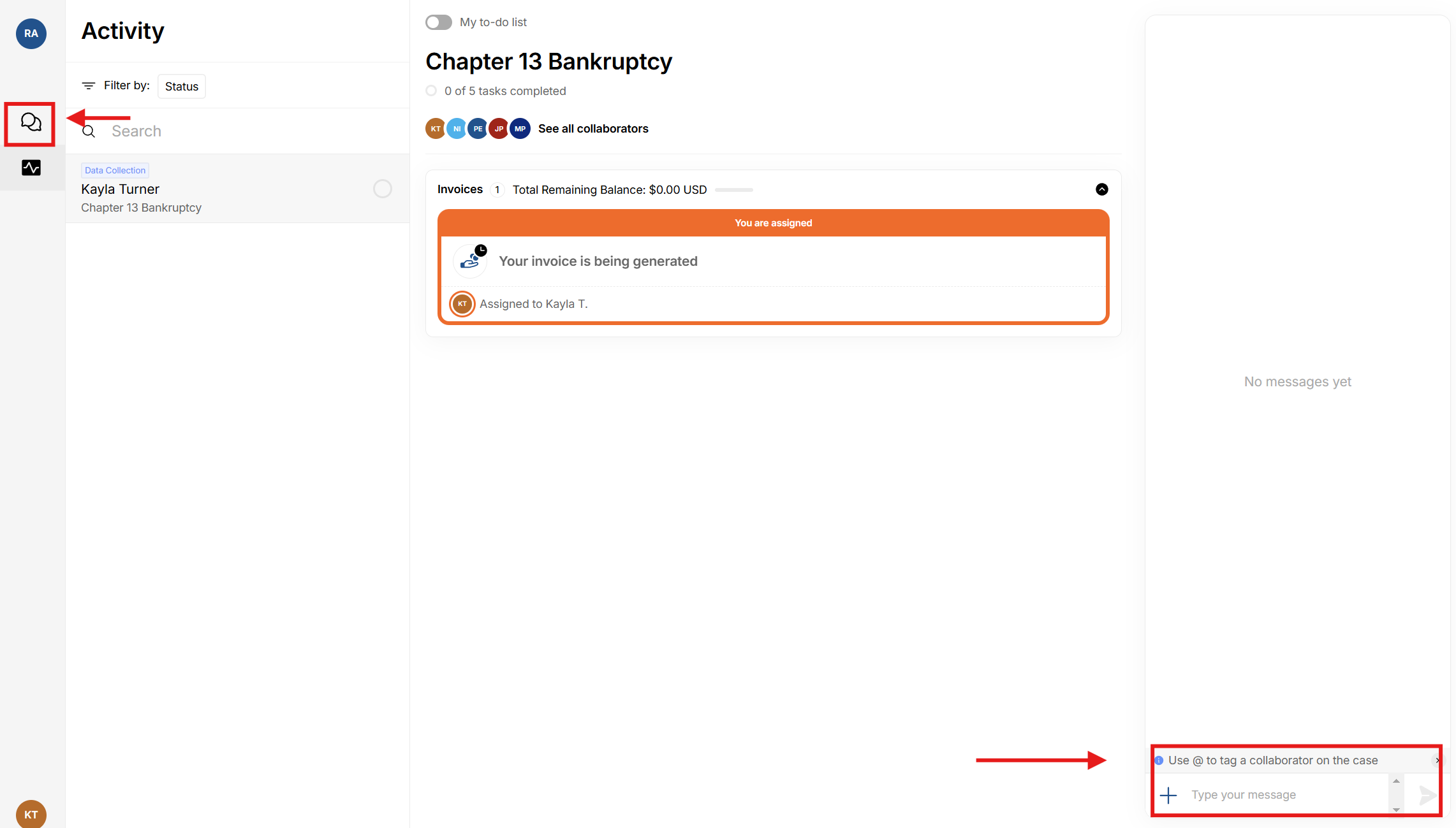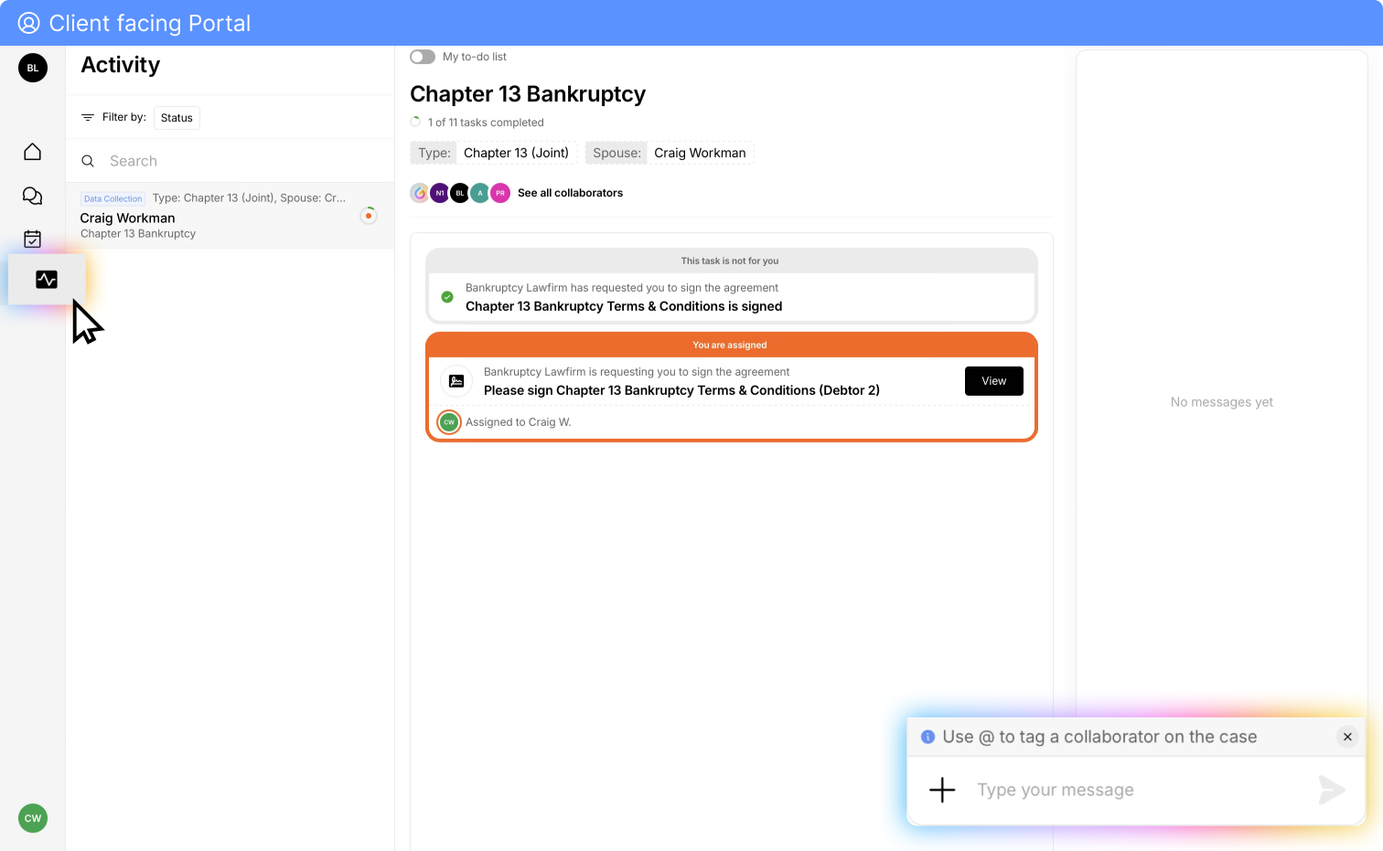 Access from Portal: Clients can use the Glade chat feature on the left side of their dashboard (message bubble icon), if they have questions about the process or need technical support. To the right of their dashboard, they will see the discussion panel. This is where they can speak directly with the attorney or paralegal working on their case, or Glade support. Simply "@" the person the message is intended for, and the recipient will be notified of the message.