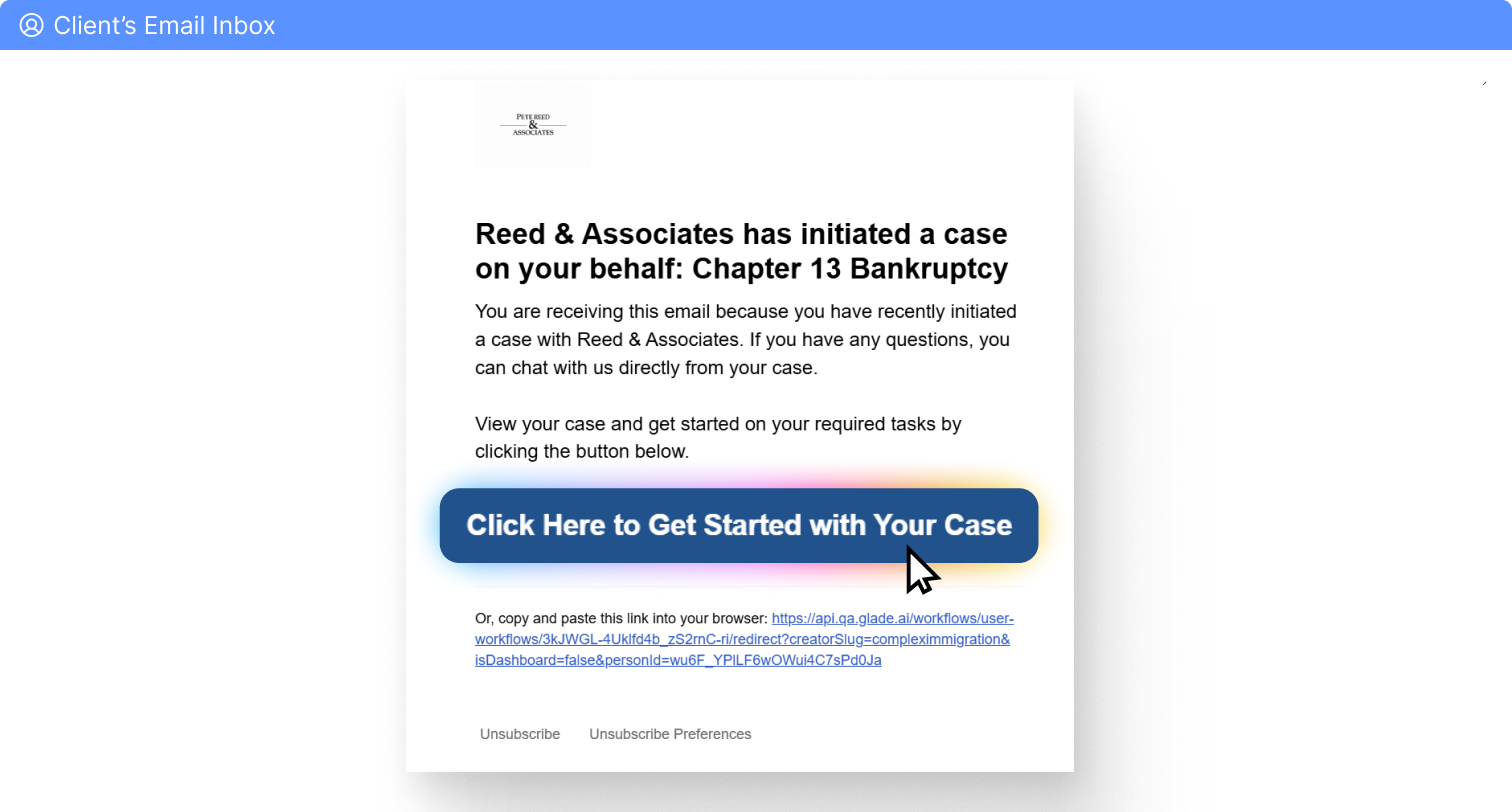 Clients should follow the button that says "click here to get started with your case", or copy and paste the hyperlink included into their browser.