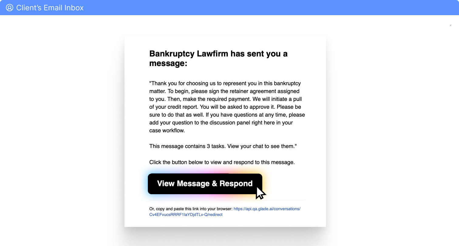 When you set up a workflow in Glade, our AI agent automatically generates a tailored document checklist based on the case type and requirements. This ensures every necessary document is accounted for from the start. These document checklists can be customized, so you may skip documents you do not require, or add new requests as needed.Automated Client Communication: