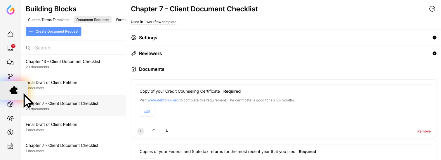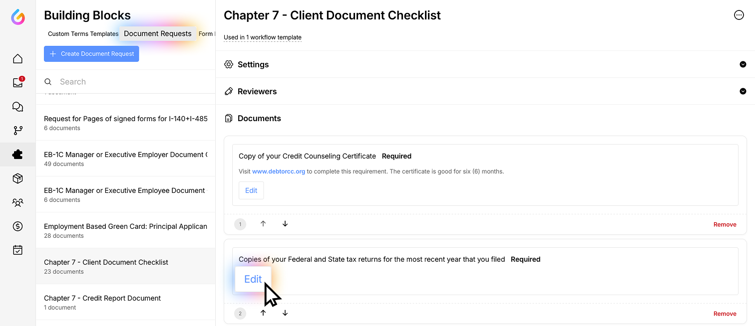 Select the Document Requests section. Locate the checklist you wish to use or adjust (e.g., "Chapter 7 - Client Document Checklist").