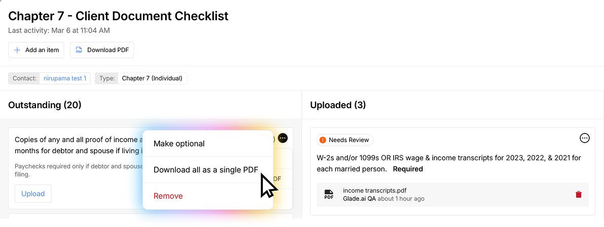 The Document Checklist tab in Glade allows clients to easily upload, manage, and convert necessary files into a single PDF format for seamless organization. Follow these steps to convert files: