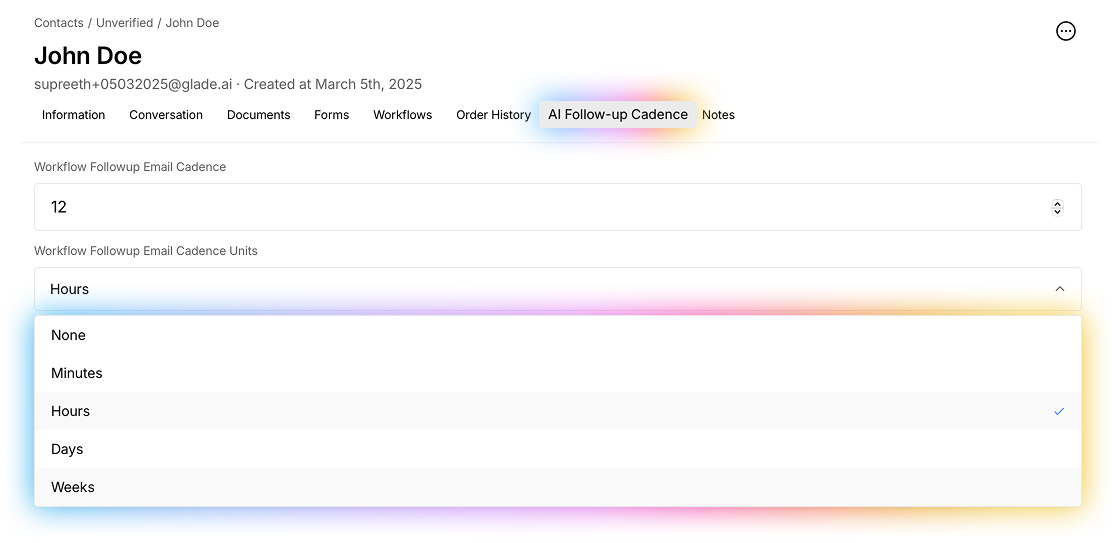 Decide the cadence you prefer & the units. Adjust the follow-up frequency (a.k.a cadence & units) by selecting from the available options, such as: