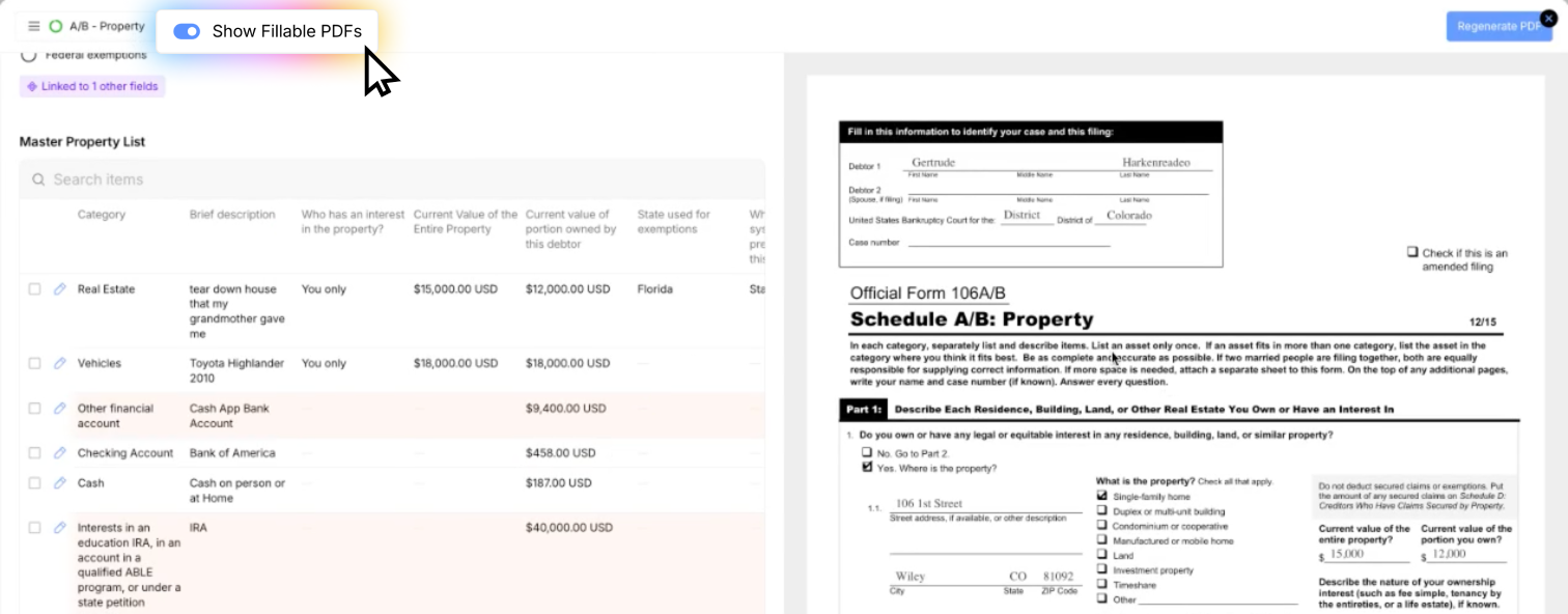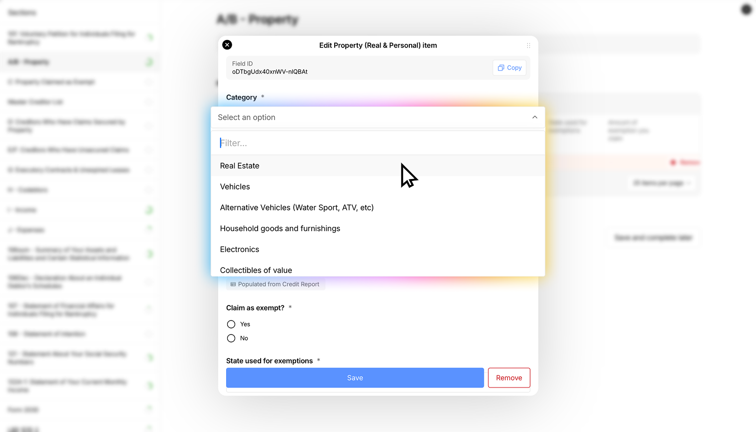 Adding assets to Schedules A/B and claiming exemptions in Schedule C is a critical part of bankruptcy filing. Glade's Bankruptcy Schedules Builder automates much of this process with AI assistance for determining appropriate exemptions.