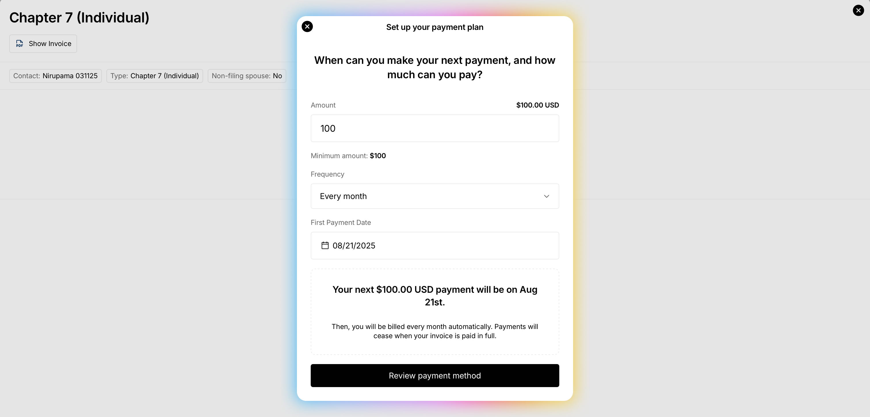 Option to Set Up a Payment Plan is only visible in cases your attorney has enabled it for the workflow. If not, it wont be visible.