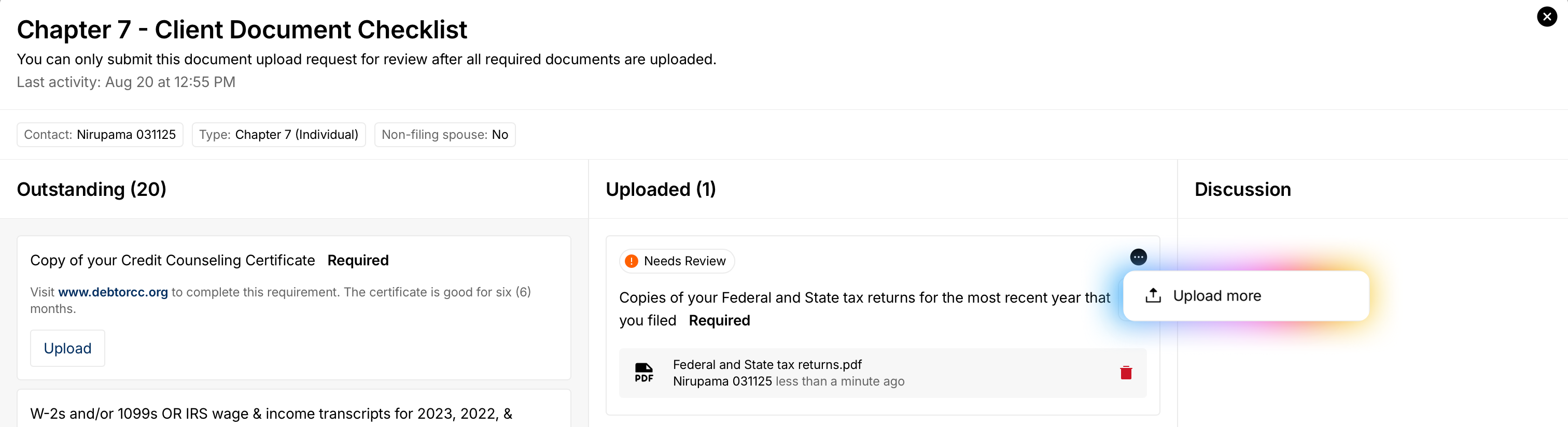 “Upload More” missing: Click the (⋯) menu for the checklist item and select Upload More.
