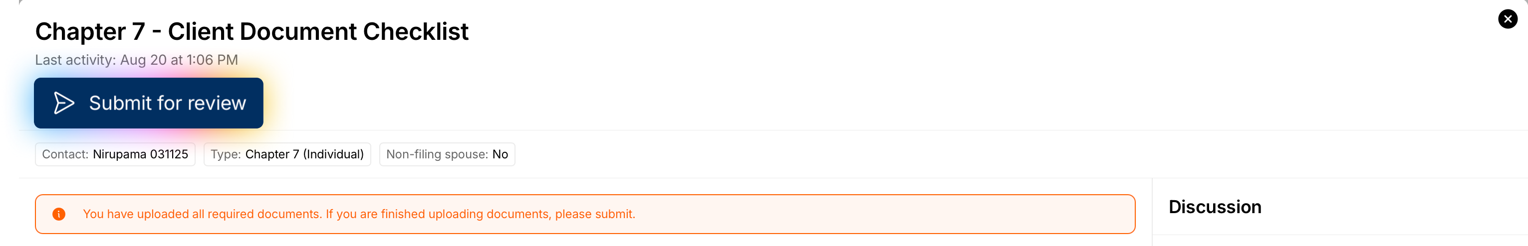 When you’ve added all Required documents, a modal will pop up asking if you want to submit or continue uploading. Once you are finished, click Submit for review.