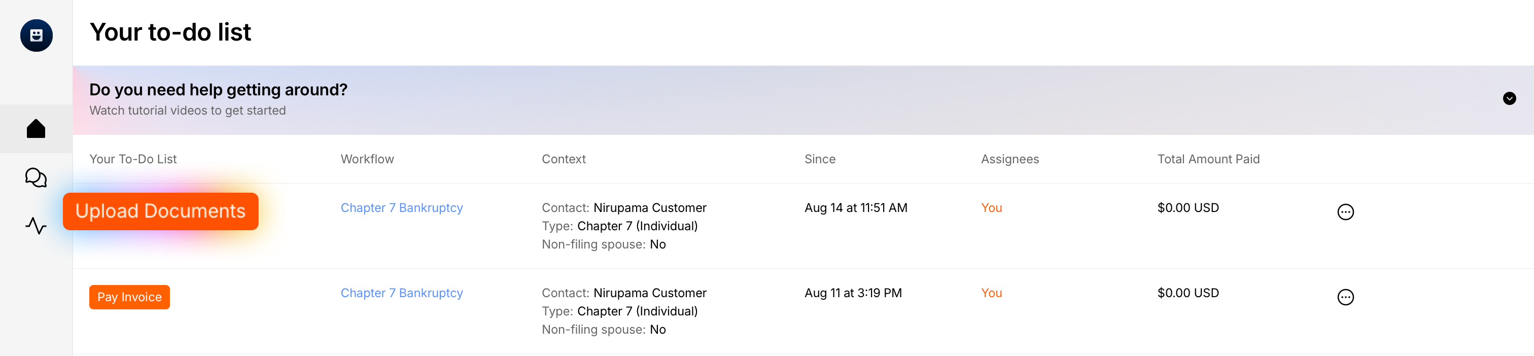 Can’t see “Upload Documents” on Home: Refresh the page or go to Activity → Workflow → Document Checklist and click View.