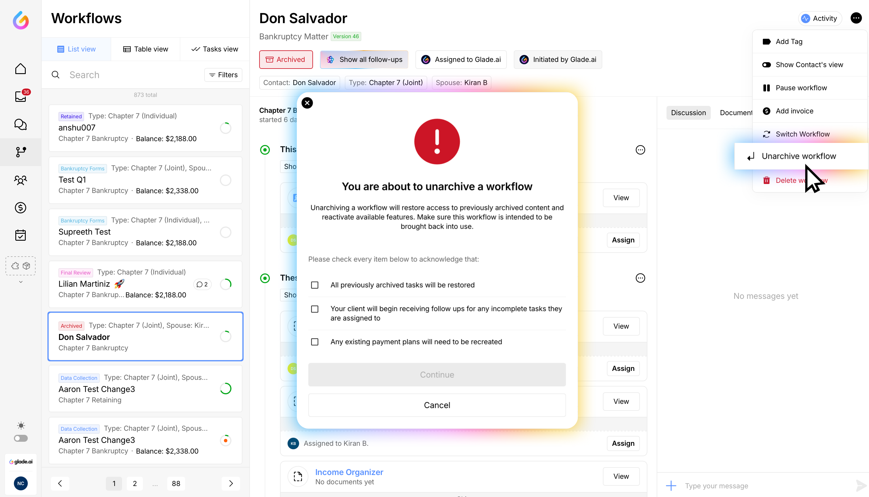 Unarchiving brings a Workflow back to an active state so your team can continue work. This restores tasks, resumes client follow‑ups, and lets you pick up where you left off—useful if a Workflow was archived by mistake or the case has reopened.
