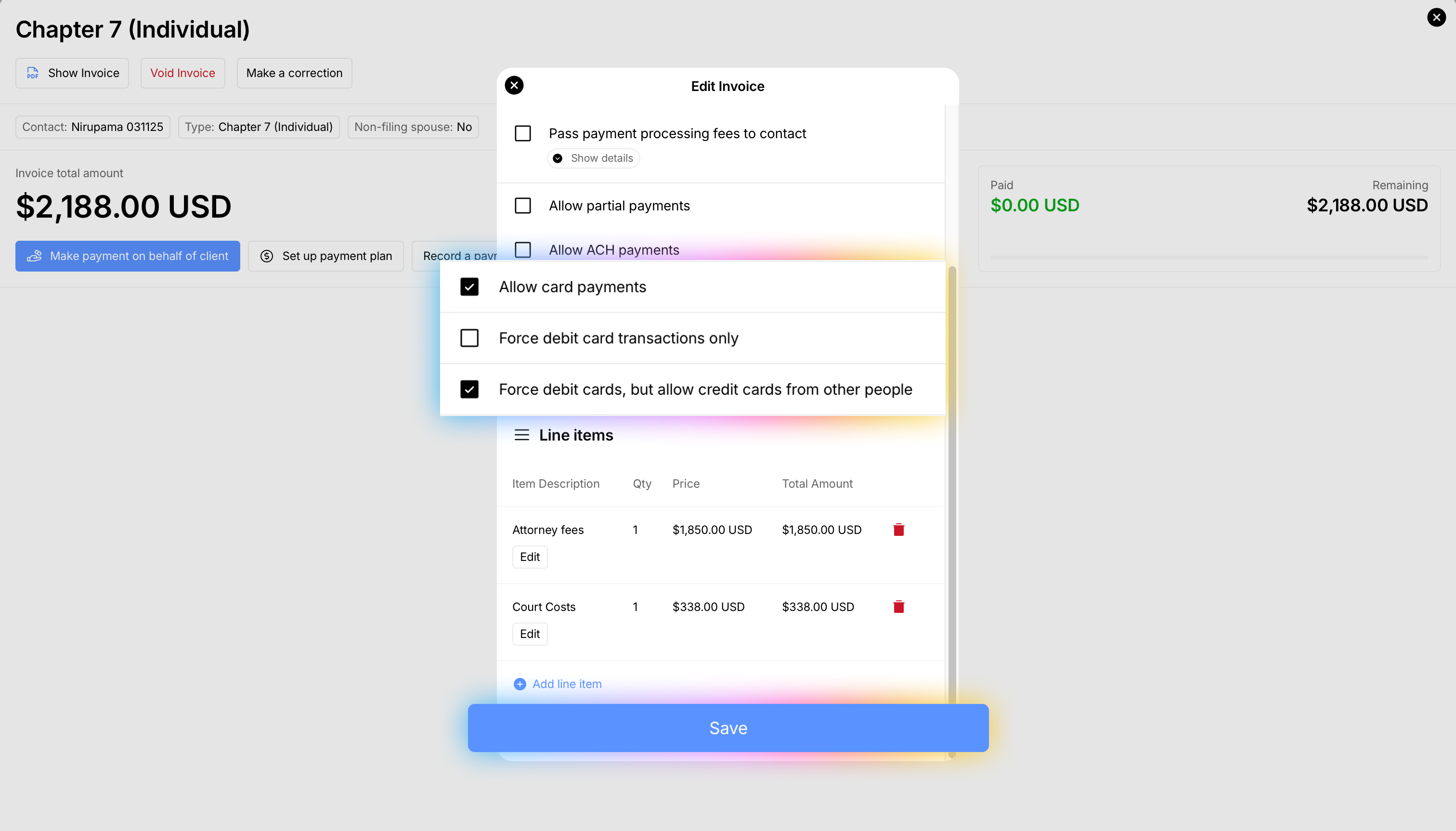 Sometimes a third party (e.g., a family member) needs to pay a client’s invoice with their credit card. This setting lets you keep debit‑card enforcement for the client while allowing credit card payments from someone else so bills get paid on time and your Workflow keeps moving.
