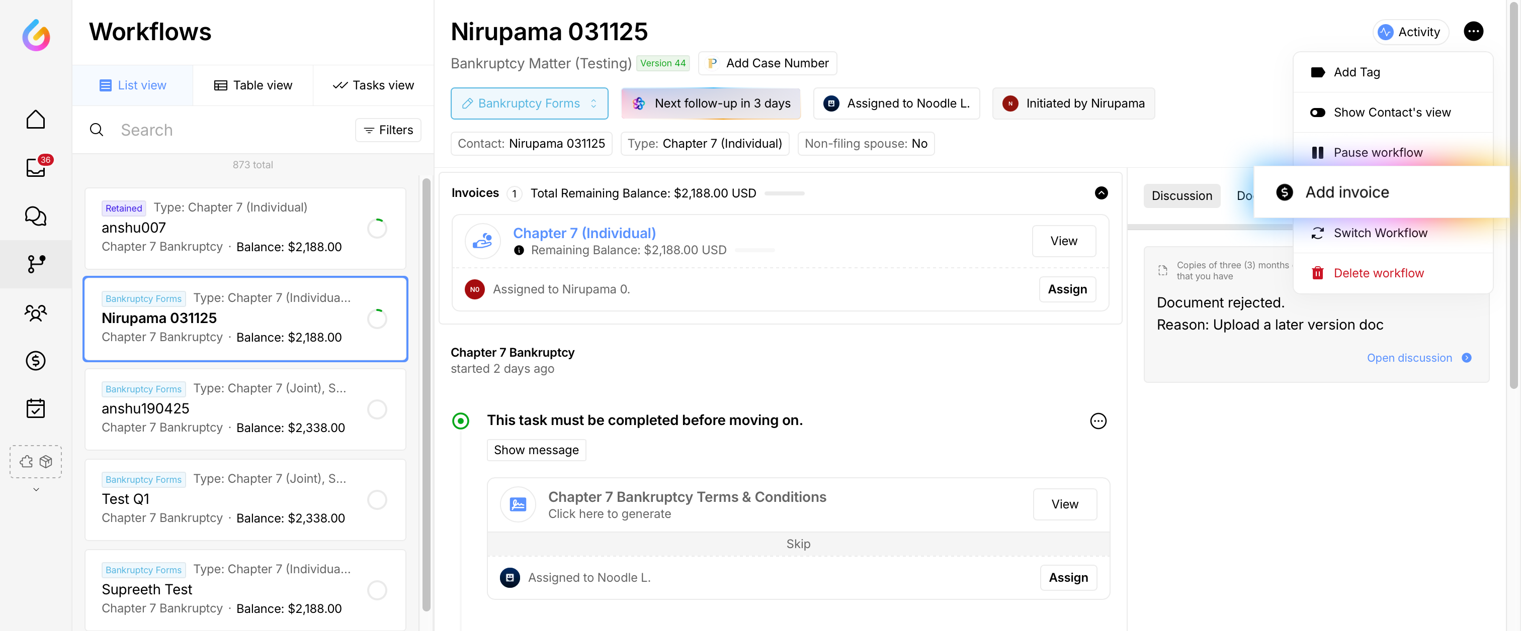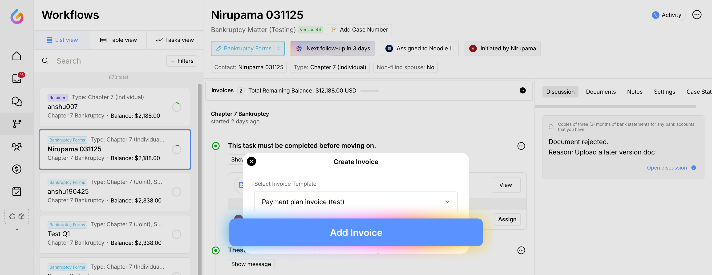 Adding an invoice directly from a Workflow keeps billing in sync with your case work, triggers the right client notifications, and helps payments arrive on time.
