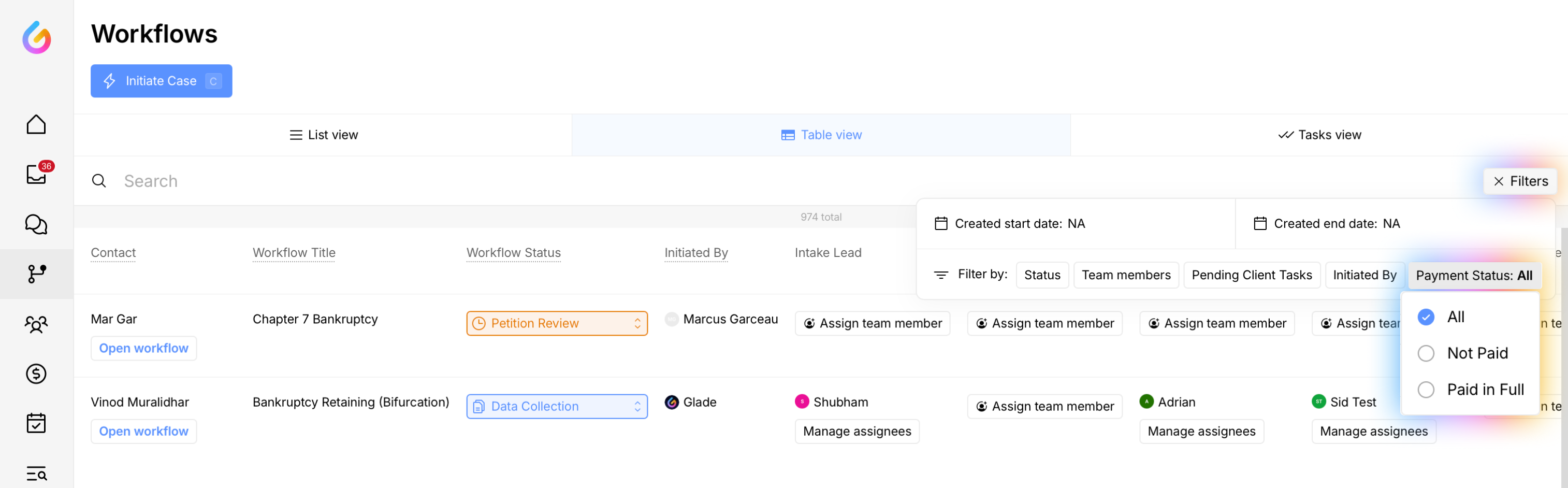 Quickly find which Workflows still owe money and which are Paid in full using filters on your Workflows table.